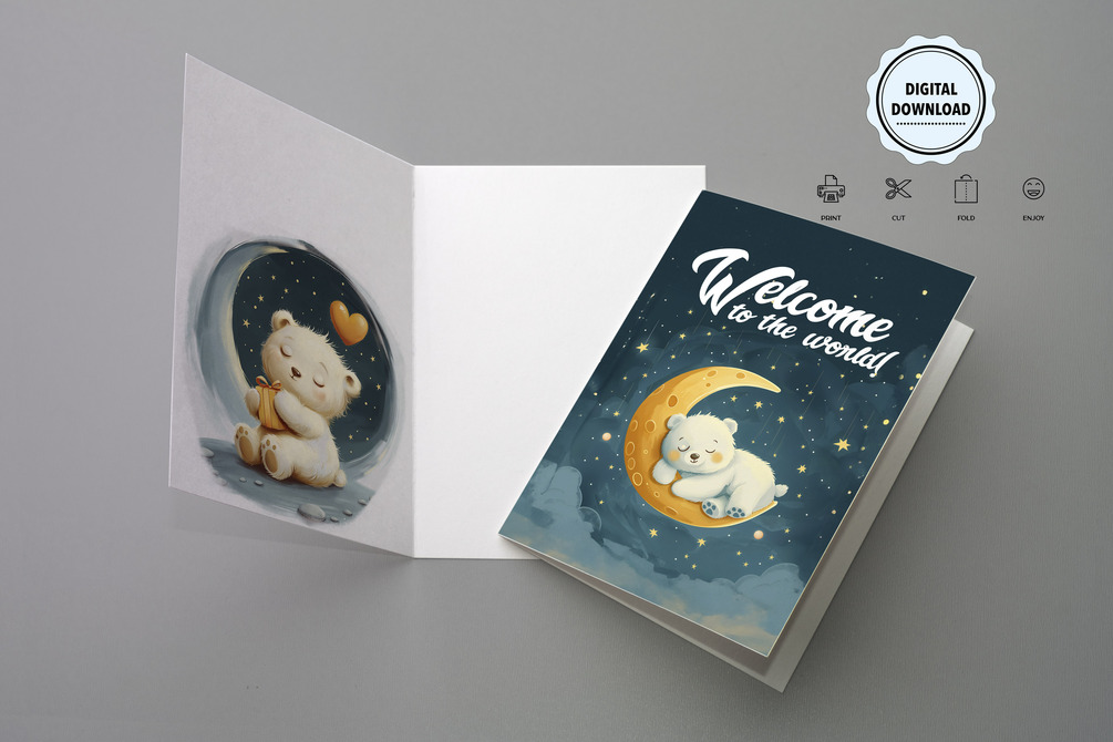 Celebrate the arrival of your little one with our enchanting printable baby announcement card! Featuring an adorable bear sleeping on a crescent moon against a starry night sky, this beautifully designed card is perfect for welcoming a new baby to the world.