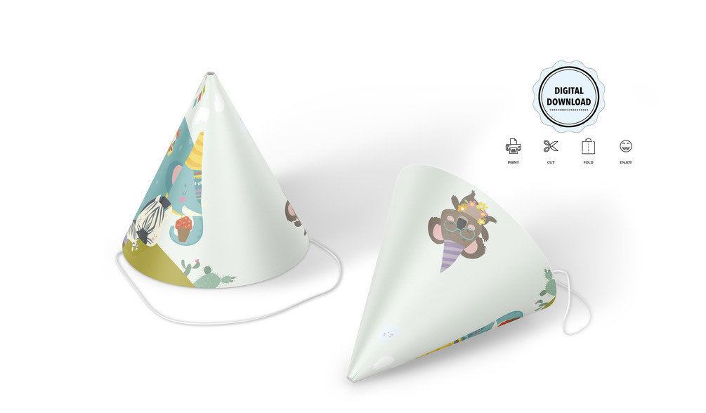 Add a playful touch to your child's birthday celebration with our adorable printable party hats, featuring a delightful animal-themed design. These charming party hats are the perfect addition to any birthday party, bringing joy and smiles to all the little guests.