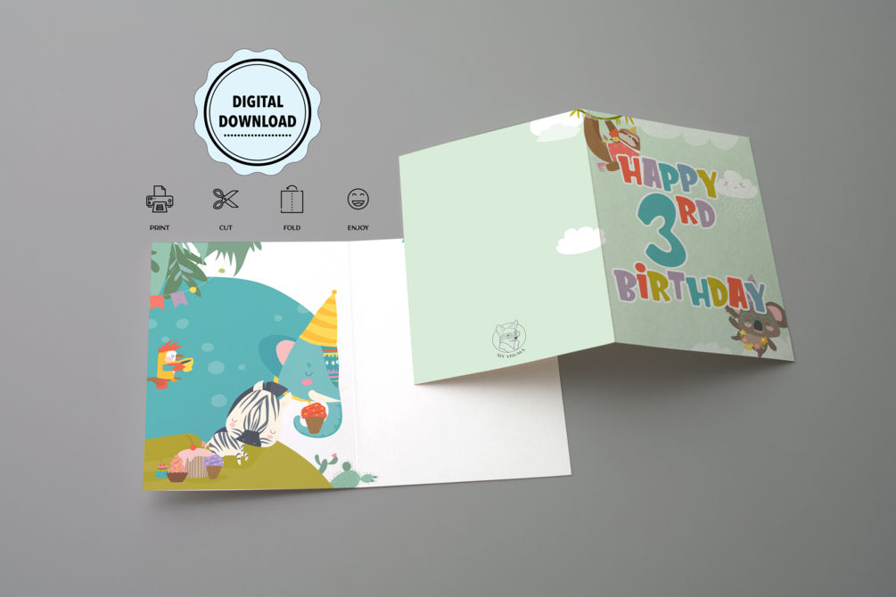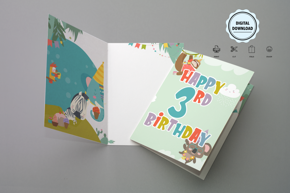 Celebrate your child's 3rd birthday with our charming, printable digital download birthday card featuring adorable animals in a delightful scene. This playful illustration brings a touch of fun and joy to this special milestone, making it the perfect card to send birthday wishes and smiles.
